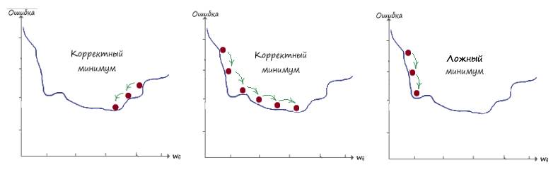 На следующей иллюстрации показано несколько вариантов градиентного спуска, один из которых приводит к ложному минимуму.