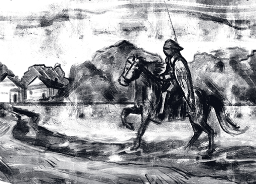 Всадник ничего не ответил, даже не мотнул головой. Из-за узкой щели личины не было видно ничего, кроме черноты. Не было ясно, куда глядел воин, о чем он думал. Его железная маска хранила столько тайн, сколько не скрывалось в библиотеке Ривернира. Наконец, наездник слегка махнул копьем. Это стало знаком для его лошади, которая парой мощных ударов копыт взрыхлила землю и помчалась прямиком к церкви. Люди в панике расступились, а разбойники в ужасе застыли на своих местах. Острое копье пронзило одного беззаконника, он тут же кубарем скатился с лестницы.