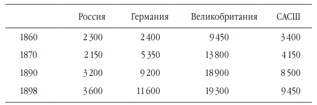 В конце 1890-х гг. Менделеев подвёл в абсолютных цифрах национальные итоги конкуренции «свободной торговли» и протекционизма в течение XIX века и, в частности, за 1860–1898 гг., что можно округлённо суммировать по его данным в финальную таблицу, ярко демонстрирующую гораздо большие успехи протекционистских Гер- мании и США по сравнению с фритредерской Великобританией: