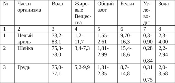 Химический состав: криля антарктического имеет широкие колебания обусловленные сезоном года и стадией развития, особенно самок.