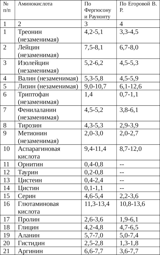 Белки криля антарктического характеризуются относительно высоким содержанием (около 40%) незаменимых аминокислот. Аминокислотный состав белков криля антарктического по Фергюсону и Раунонту и Егоровой В. Р. приведен в таблице: