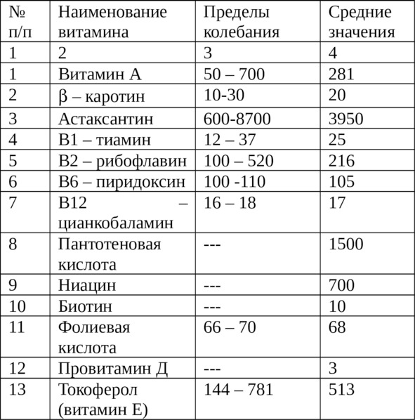 Содержание витаминовв криле антарктическом.(в мкг / 100 сырой массы).