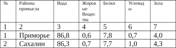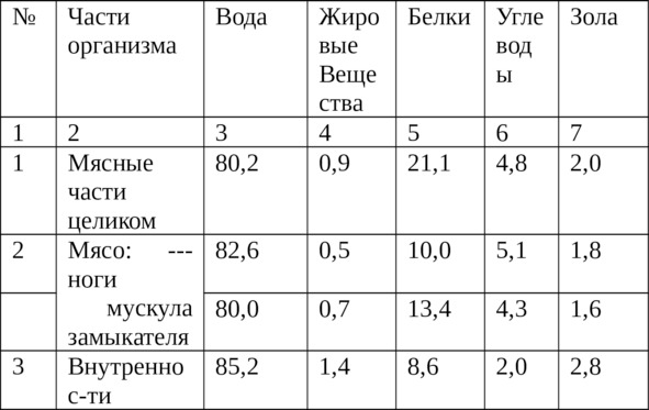 Массовый выход при переработке составляет (в %): мантия – 3,1- 4,6; мускул – замыкатель – 2,4—3,1; нога – 5,4—7,2; жабры – 1,8—3,4; внутренности – 5,4—6,8 Таблица № МС-1