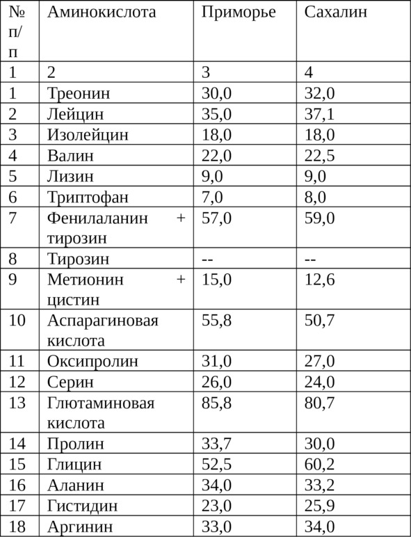 Общее количество не заменимых аминокислот составляет 29% всей суммы аминокислот белков у кукумарии японской (морского огурца). Таблица № КЯ-3
