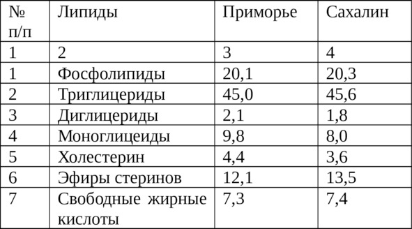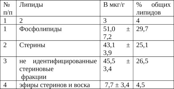Из таблицы видно, что липиды кукумарии японской на 45% представлены триглицеридами, т.е. наиболее полноценной частью липидов, и не содержат труднорастворимых восков и высокомолекулярных спиртов.