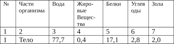 Макроэлементы мяса мидий (в мг%): фосфор – 150,0; кальций – 45,0; железо – 15,0—22,0; кремний – 15,0; цинк – 1,5—4,5; стронций – 1,5; марганец – 1,5; медь – 0,75; кобальт – 0,03; никель – 0,105; барий – 0,06—0,075; серебро – 0,003; титан – 0,30—0,45; йод – 0,18—0,25. Таблица № МО-2
