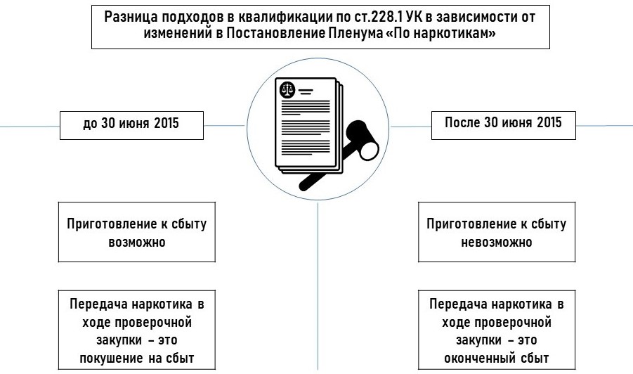 С 30 июня 2015 года Пленум изменил подход не только к приготовлению по ст.228.1 УК, поменялся в целом подход к тому, что считать оконченным и неоконченным преступлением, применительно к сбыту.