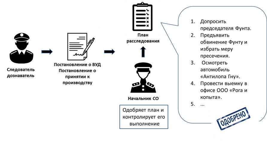 Сразу после того как следователь принял дело к своему производству (ч.1 ст.156 УПК) он обычно составляет необязательный в рамках УПК документ – «план расследования уголовного дела». В нём содержится весь перечень будущих действий следователя с указанием дат. Перечисляются допросы свидетелей, экспертизы, дата будущего предъявления обвинения, дата ознакомления участников с материалами дела и пр. Этот документ подписывает руководитель следственного отдела. В последующем, на всех планерках, совещаниях будет производится сверка текущей ситуации с датами, указанными в плане расследования.