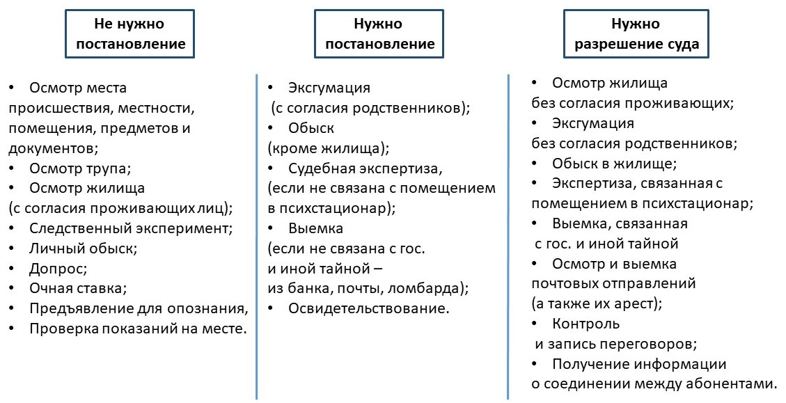 Некоторые действия проводятся без предварительного оформления, просто по желанию следователя, некоторые требуют вынесения следователем постановления о проведении следственного действия, а некоторые требуют судебного одобрения.