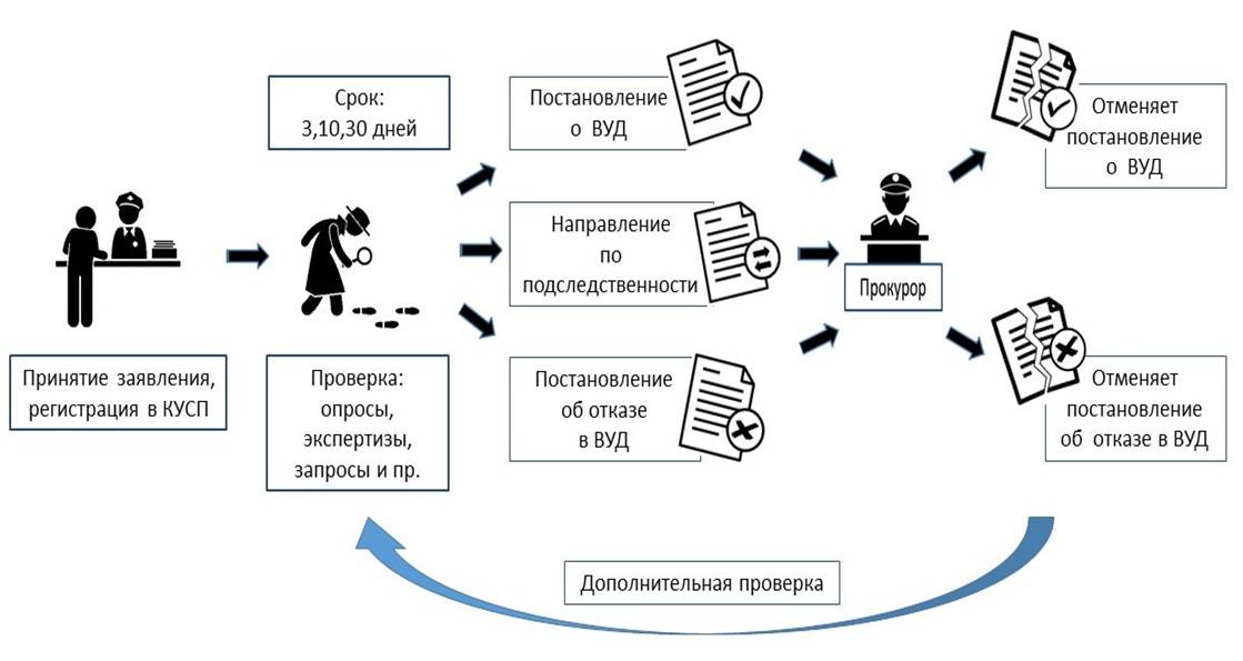 Сообщение регистрируется в КУСП (Книгу учета сообщений о преступлениях) и направляется исполнителю, который проводит доследственную проверку. Регистрация в КУСП позволяет проверить в последующем, что основания и поводы для возбуждения дела вообще были.