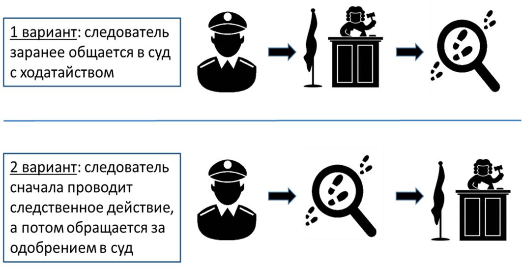 Некоторые следственные действия требуют судебного разрешения и это отдельный порядок со своими нюансами. Смысл порядка в том, чтобы установить судебный контроль над действиями следствия, которые нарушают конституционные права – права на неприкосновенность жилища, тайну переписки, семейную тайну и пр. Контроль, впрочем, получается довольно условный.