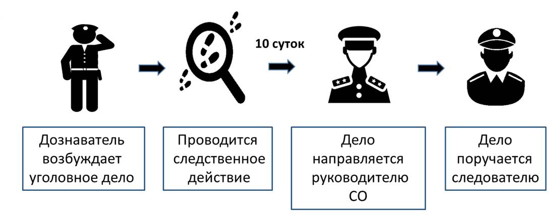 Возбуждается уголовное дело и после этого проводятся действия в обычном, установленном для них порядке. Но дальше, в течении десяти суток дело нужно отдать следственному органу, иначе все дальнейшие действия по делу будут недопустимы. Это как детская игра в «горячую картошку» – дело и все материалы нужно срочно спихнуть следствию.