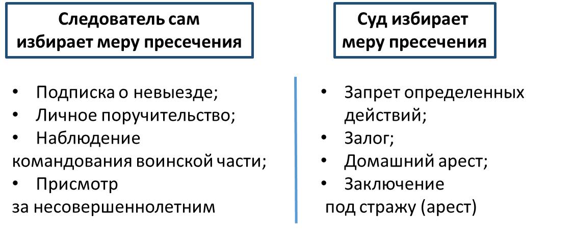 Как мы видим, самые серьезные меры пресечения назначаются только через суд. Все остальные меры следователь назначает сам.