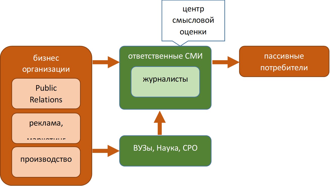 Стоит подчеркнуть важность носителей знаний в коммуникациях: ВУЗы, научные организации. На Западе гигантскую роль играли и играют саморегулируемые организации, как специалистов, так и компаний. Конечно, носители знаний не были прямым звеном в цепочке движения информации, но они создавали справедливый информационный фон для потребителя. Всегда подразумевалось наличие интеллектуального судьи, у которого можно было бы получить финальную, экспертную оценку. Например, если компания считается известной, то её рейтинг подтверждался оценкой отраслевого СРО. Многие СРО на Западе имеют, кстати, многосотлетнюю историю. Если лекарство подается как многообещающее, то такая оценка подтверждается специалистами ВУЗов.