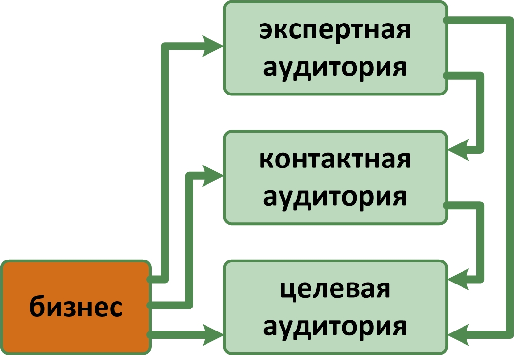 Наличие переносчиков информации делает структуру аудитории многоуровневой или сетевой. Примерный вид диаграммы аудитории показан на следующем рисунке.