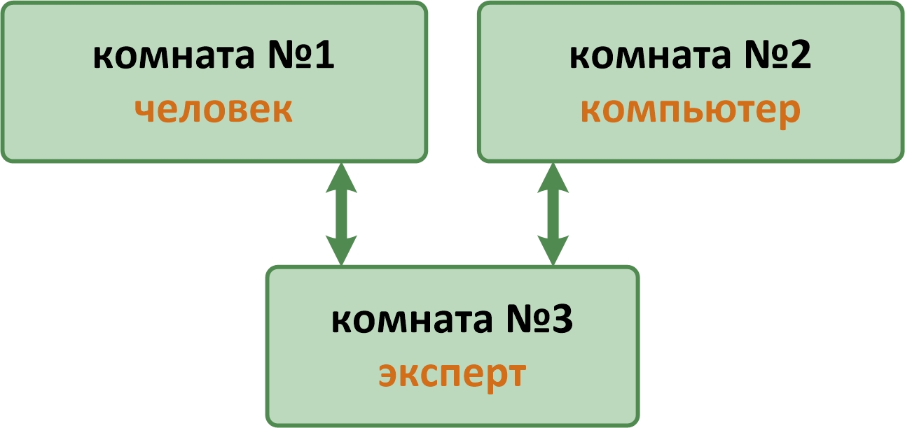 Вся хитрость в том, что эксперт не знает в какой комнате сидит человек, а в какой комнате работает компьютер. Эксперту ставят ограничение на число вопросов, скажем не более 100. Когда вопросы завершаются, эксперт должен указать в какой комнате сидел человек, а в какой комнате работал компьютер.