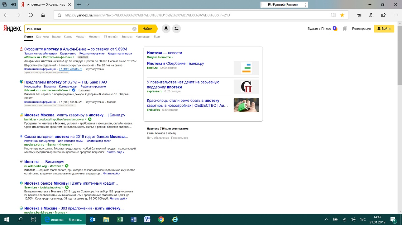 Посмотрим на результат поиска компанией Яндекс в ответ на запрос «ипотека».