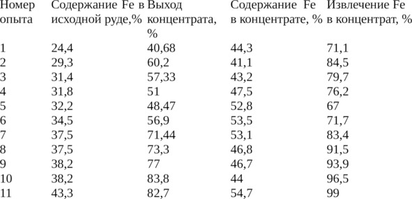 Автором изучена зависимость показателей обжигмагнитного обогащения от содержания железа в исходном руде. Результаты проведенных 11 опытов с содержанием железа в исходной руде в интервале от 24,4 до 43,3% приведены в табл.4. Графическая обработка показателей показана на рис.1