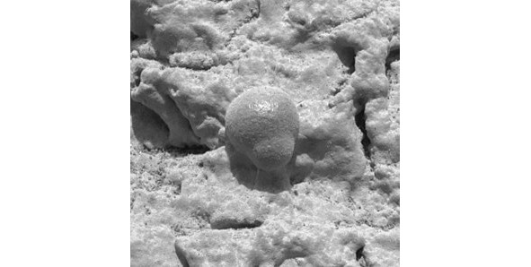 Микрофотография конкреции гематита в марсианском грунте, снятая марсоходом «Оппортьюнити» 2 марта 2004 года (поле зрения 1,3 см), что свидетельствует о присутствии в геологическом прошлом воды в жидком состоянии