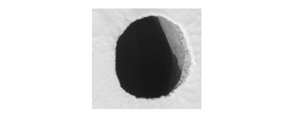 Так называемая «чёрная дыра» (колодец) диаметром более 150 м на поверхности Марса. Видна часть боковой стенки. Склон горы Арсия (фото «Марсианского разведывательного спутника»)
