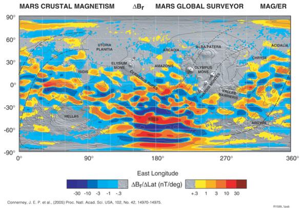 По одной теории, опубликованной в 1999 году и перепроверенной в 2005 году (с помощью беспилотной станции «Марс Глобал Сервейор»), эти полосы демонстрируют тектонику плит 4 миллиарда лет назад – до того, как гидромагнитное динамо планеты прекратило выполнять свою функцию, что послужило причиной резкого ослабления магнитного поля. Причины такого резкого ослабления неясны. Существует предположение, что функционирование динамо 4 млрд лет назад объясняется наличием астероида, который вращался на расстоянии 50—75 тысяч километров вокруг Марса и вызывал нестабильность в его ядре. Затем астероид снизился до предела Роша и разрушился. Тем не менее, это объяснение само содержит неясные моменты и оспаривается в научном сообществе.