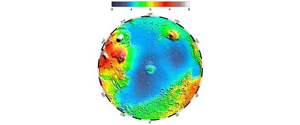 Равновеликая азимутальная проекция Ламберта рельефа поверхности Марса от северного полюса до экватора, отснятого высотомером MOLA. Граница Северной низменности сильно напоминает берег океана, возможно, покрывавшего эту площадь в древности.
