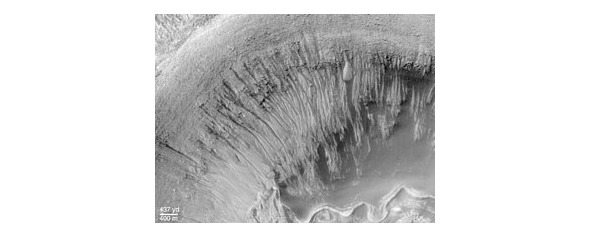 Узкие овраги на склоне кратера Ньютон, возможно, созданные потоками жидкой воды. Снимок аппарата Mars Global Surveyor, 2000 г.