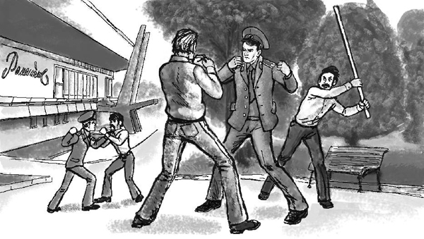 Как «зацепились» военные с местными, с какой перебранки все началось, доподлинно установить не удалось (даже военному следствию). По одной из версий, драку спровоцировали подвыпившие старшекурсники, проверяя крепость лба оппонентов каблуком казенной обуви. Вскоре все мужское население горящего неоновыми огнями очага культуры, оставив танцы, сошлось в кулачном бою. Силы были неравные, никого не трогавшие курсанты-первогодки оказались в меньшинстве. Видя, что в этой заварухе старшим товарищам несдобровать, морпех потащил в сторону одного из них – сержанта-четверокурсника. Да только будущий офицер все время что-то терял: фуражку, облик и подвижность. Вызволив сослуживца, курсанты угодили из огня да полымя. В очередной раз поднимая с земли головной убор, экс-водитель БРДМ получил подлый удар по затылку. Как потом оказалось, приличным брусом от парковой скамейки. А дальше – провал, кромешная тьма… Один из нерастерявшихся бойцов метнулся за подмогой.