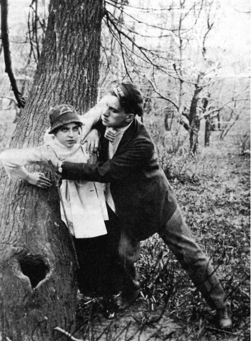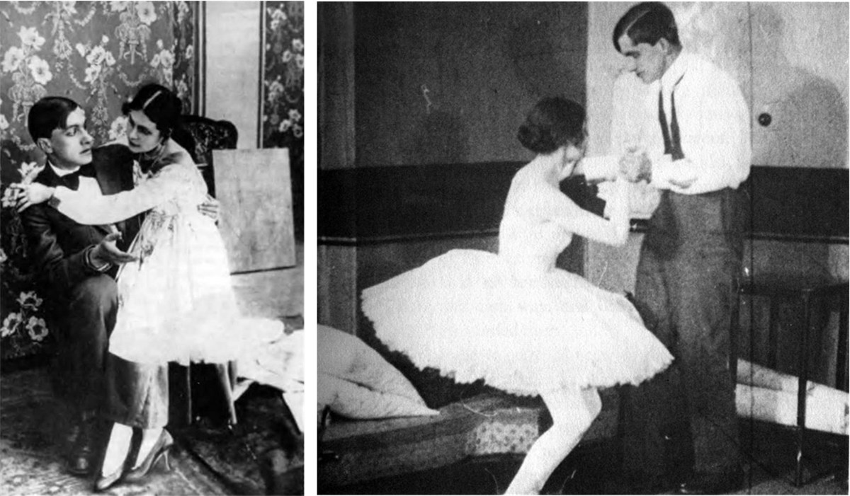 Илл. 6, 7. В. В. Маяковский в роли Художника и Л. Ю. Брик в роли Балерины (кадр из фильма «Закованная фильмой», 1918)