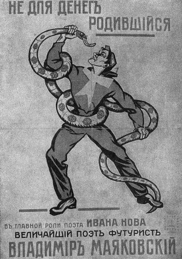 «Барышня и хулиган» был вторым фильмом с участием Маяковского в качестве исполнителя главной роли. «В акционерном обществе „Нептун“ закончены съемки фильмы „Не для денег родившийся“ – сценарий Маяковского с участием автора в роли Ивана Нова»[39], – сообщала зрителю пресса в апреле 1918 года, и именно эта работа стала дебютной картиной «актерского полугодия» поэта. По утверждению М. Поляновского, «Давид Бурлюк часто говорил Маяковскому, что он внешне похож на Идена, и, может быть, это и навело Маяковского на мысль экранизировать роман и сыграть самого себя»[40]. Так или иначе, но воодушевленный предложением владельцев «Нептуна» выбрать тему на свой вкус Владимир Маяковский выбрал роман Лондона, сам «соорудил» сценарий, сделав из героя-прозаика поэта-футуриста. Содержание несохранившегося фильма нам известно прежде всего в пересказе В. Шкловского в упомянутой выше статье 1937 года и по заметке в журнале «Мир экрана», авторство которой приписывают самому сценаристу и исполнителю главной роли: