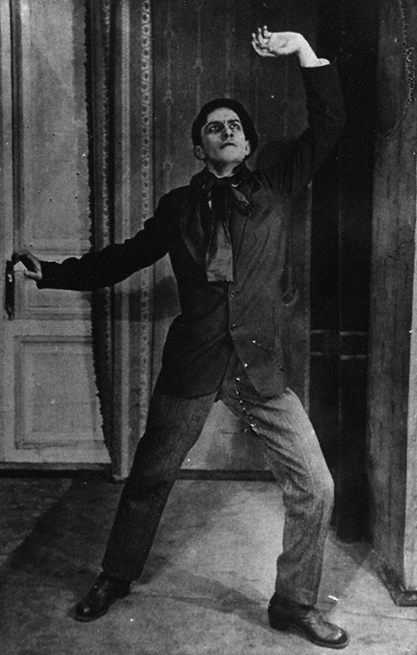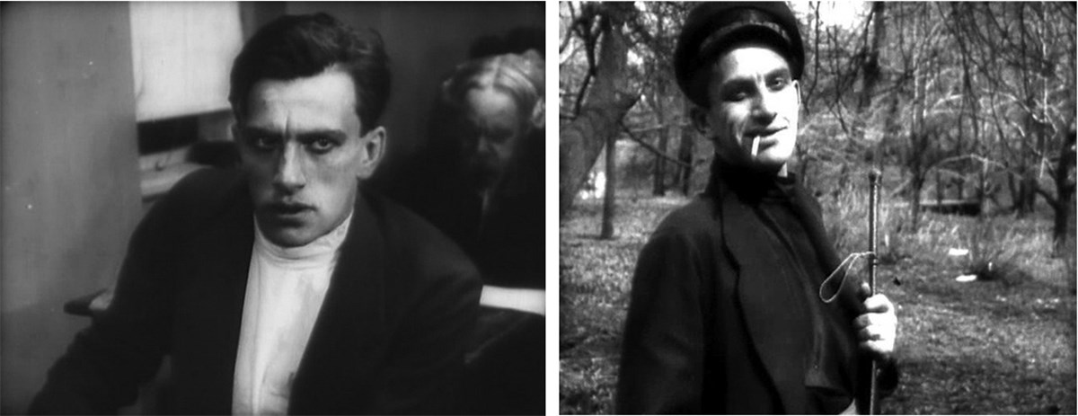 Игра Владимира Маяковского в целом вписывается в означенную традицию, хотя он пытается привнести в нее больше динамики – с первых кадров в руках героя появляется щегольской кавалерийский хлыстик, которым он активно манипулирует, выражая эмоции: вертит пальцами (беззаботность), сбивает траву и ветки (волнение или злость), отбивает дробь (нетерпение). Сам по себе аксессуар, ему по статусу не принадлежащий, действующий в нештатных условиях и ситуациях, выглядит явно ворованным, а следовательно, вполне «хулиганским», и порождаемые с его помощью «жесты-изображения» (Ю. Цивьян) вполне понятны зрителю. Вряд ли это прямая реплика тросточки Чаплина или аллюзия на фирменные жесты бродяги «Шарло», однако и ничего общего с «новаторской актерской техникой» здесь нет. Как нет ее и в жестах панического изумления в сценах видений учительницы в саду или трактире (снимает фуражку, проводит рукой по лицу), а также в жестах нарочитой независимости или высокомерной гордости, когда герой, подбоченясь, не единожды становится в позу федотовского «свежего кавалера», в жестах романтического влюбленного (преклонение колен, целование края платья) и т. п. По сути, все это – многократно отработанные немым кинематографом жесты, классические позы и движения, которые мог сыграть достаточно уверенно («без натуги») актер-дилетант.