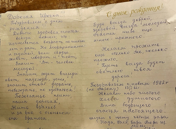 Талант Ирины Алексеевны был многогранным. Высокий уровень специалиста в области офтальмологии и заслуженное уважение коллег по работе и пациентов могли сочетаться с ее безграничными душевными качествами в основе которых была доброта. Недавно из маминого архива мне на глаза попалась толстая тетрадь, где тетя Ира записывала свои стихи. Впечатляет! На ряду с трогательными стихотворениями по случаю юбилея или дня рождения кого-то из сотрудников: от врачей, медсестер до санитарок и дворников я с трепетом читал мудрые и философские мысли о жизни, написанные как будто бы настоящим профессиональным поэтом.