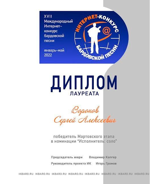 Здравствуйте! Безмерно рад нашему знакомству. Меня зовут Воронов Сергей, я родился в 1965 году и вырос в прекрасном городе Алма – Ата (Казахстан), по специальности я механик, а стихи (и не только) пишу для души. Являюсь поющим поэтом (бард), помимо книг выпускаю и CD с песнями на свои стихи. Являюсь дипломатом различных конкурсов авторской песни и особая гордость – лауреат Грушенского интернет конкурса 2022 года.