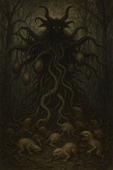 На карте изображено мрачное, древнее существо, олицетворяющее некую первозданную силу: огромная фигура с рогами, ее тело – извивающаяся масса темных корней или щупалец. Из этой массы свисают коконы, наполненные неведомыми зародышами; из-под нее выползают ползущие, новорожденные твари. Глаза существа светятся в темноте. Вся сцена заключена в зловещем, затхлом лесу – все вокруг пронизано атмосферой навязчивой плодовитости, пугающей необузданной жизни.