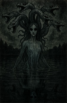 На тёмных водах безмолвного озера возвышается существо, соединяющее в себе женские очертания и жуткие черты многих змеевидных голов. Вода окутывает её тело, словно продолжение подводной тьмы и иллюзий, а множество змеинных шей и разинутых пастей оплетают её силуэт. Из глубины вод отражается бессознательное – призрачные черепа, смутные беспокойства, неразличимые очертания страха.