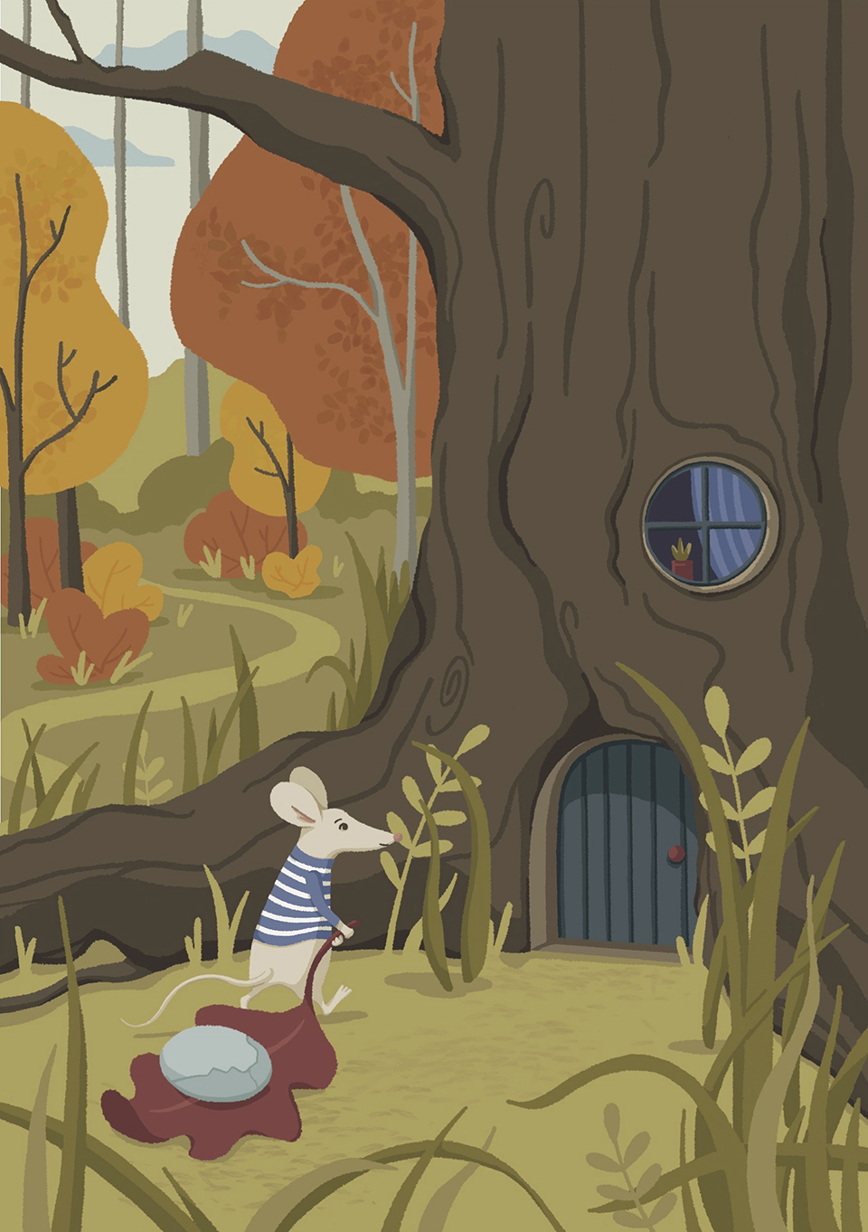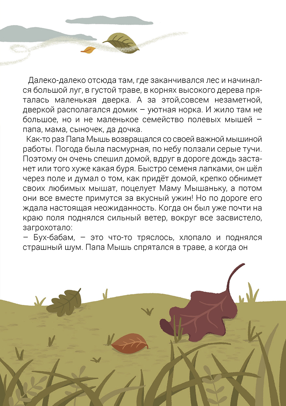 Как-то раз Папа Мышь возвращался со своей важной мышиной работы. Погода была пасмурная, по небу ползали серые тучи. Поэтому он очень спешил домой, вдруг в дороге дождь застанет или того хуже какая буря. Быстро семеня лапками, он шёл через поле и думал о том, как придёт домой, крепко обнимет своих любимых мышат, поцелует Маму Мышаньку, а потом они все вместе примутся за вкусный ужин! Но по дороге его ждала настоящая неожиданность. Когда он был уже почти на краю поля поднялся сильный ветер, вокруг все засвистело, загрохотало – бух-бабам, – это что-то тряслось, хлопало и поднялся страшный шум. Папа Мышь спрятался в траве, а когда он наконец открыл глаза и высунулся из своего укрытия, то увидел, что совсем рядом с ним упало чье-то гнездо, а в его веточках лежало яйчко..