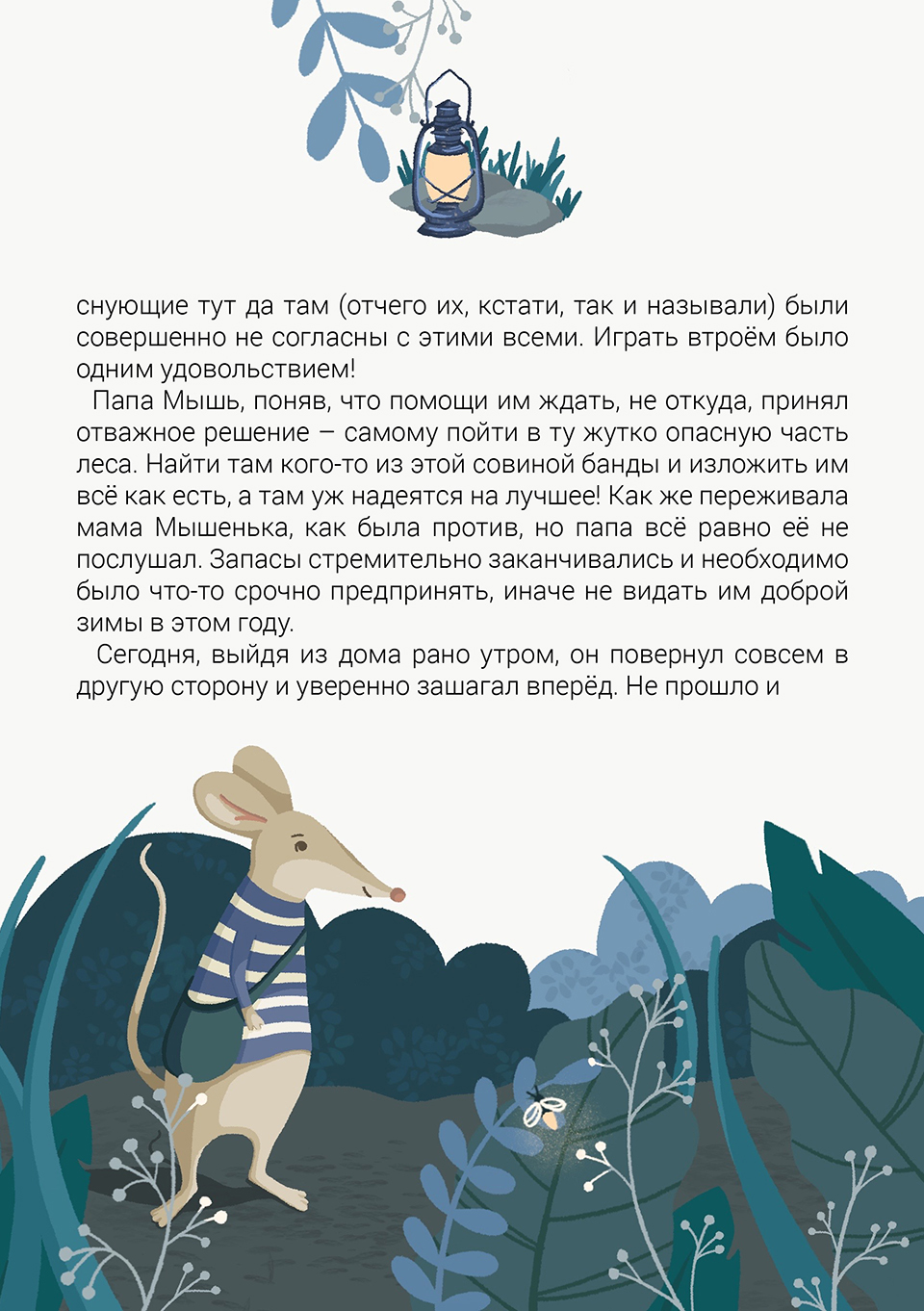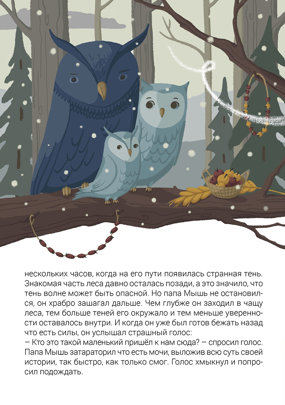 Папа Мышь, поняв, что помощи им ждать, не откуда, принял отважное решение – самому пойти в ту жутко опасную часть леса. Найти там кого-то из этой совиной банды и изложить им всё как есть, а там уж надеятся на лучшее! Как же переживала мама Мышенька, как была против, но папа всё равно её не послушал. Запасы стремительно заканчивались и необходимо было что-то срочно предпринять, иначе не видать им доброй зимы в этом году.