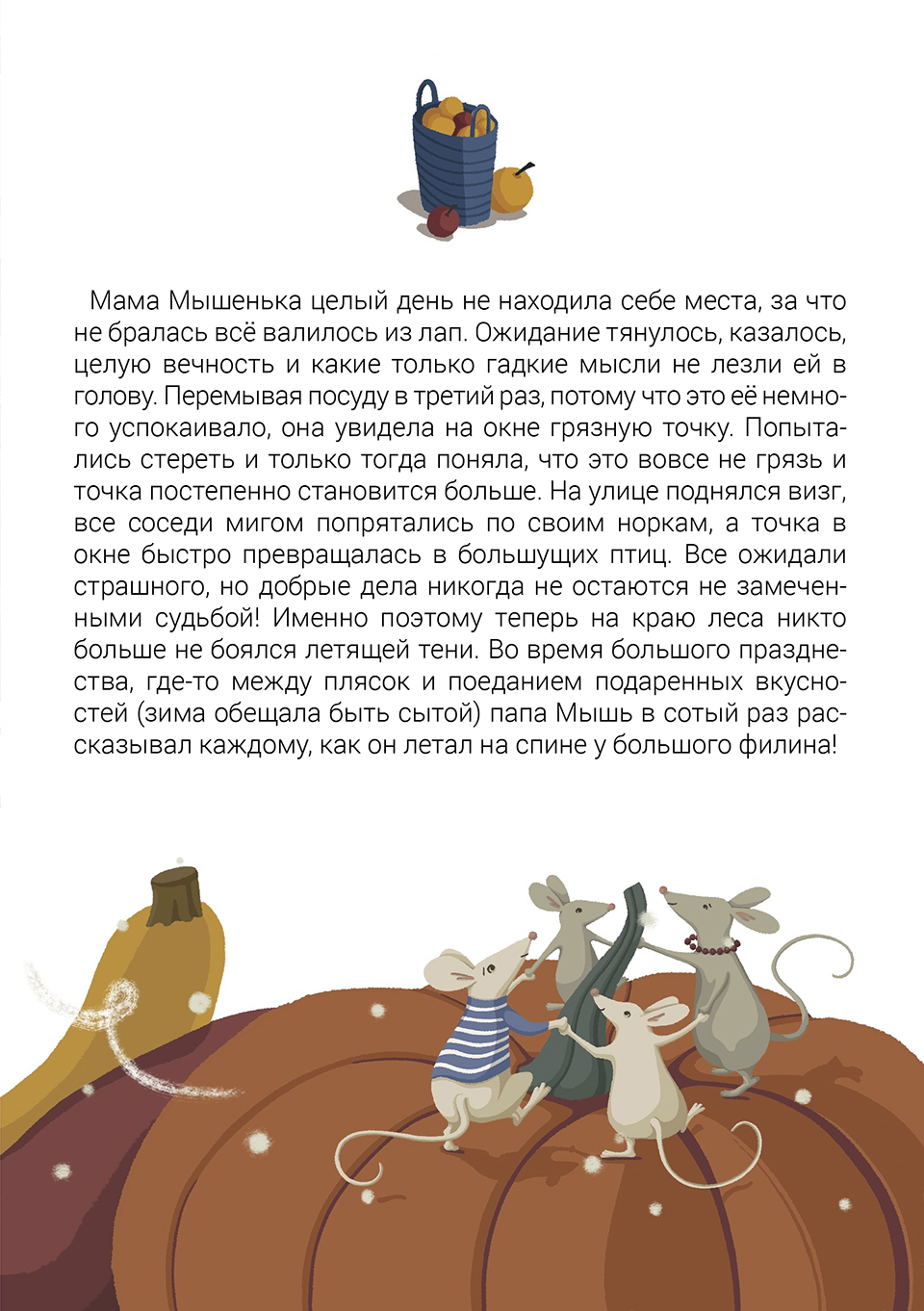 Все ожидали страшного, но добрые дела никогда не остаются не замеченными судьбой! Именно поэтому теперь на краю леса никто больше не боялся летящей тени. Во время большого празднества, где-то между плясок и поеданием подаренных вкусностей (зима обещала быть сытой) папа Мышь в сотый раз рассказывал каждому, как он летал на спине у большого филина!