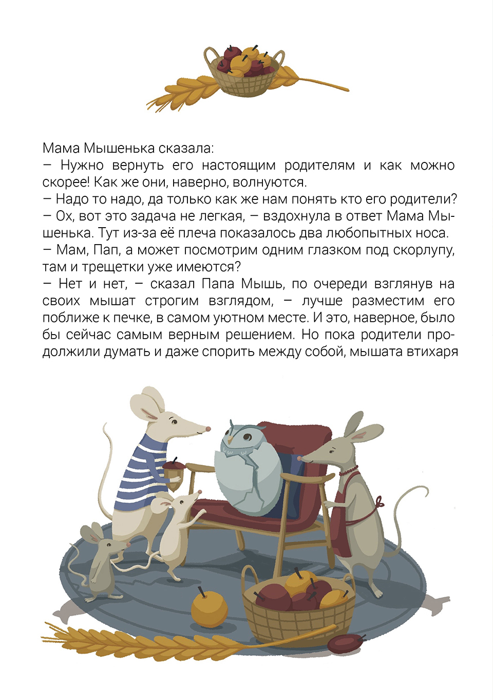 Взрослые хорошо понимали, что чем скорее найдутся его родители, тем для всех же будет лучше. Папа Мышь даже обратился за помощью в местный совет полевых грызунов, но там только развели лапами и выпучили глаза от такой новости. Невиданное дело сова, пусть и маленькая, живет среди них!