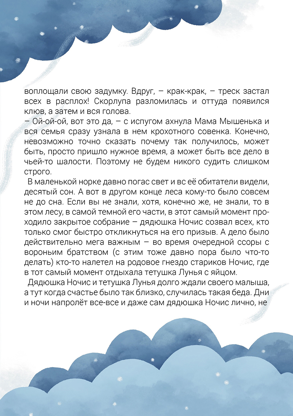 – Нет и нет, – сказал Папа Мышь по очереди взглянув на своих мышат строгим взглядом, – лучше разместим его поближе к печке, в самом уютном месте. И это, наверное, было бы сейчас самым верным решением. Но пока родители продолжили думать и даже спорить между собой, мышата втихаря воплощали свою задумку. Вдруг, – крак-крак, – треск застал всех в расплох! Скорлупа разломилась и оттуда появился клюв, а затем и вся голова.