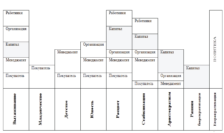 К этапам роста (взросления) относятся: выхаживание, младенчество, детство («давай-давай»), юность и расцвет; к этапам спада – стабилизация, аристократизм, ранняя бюрократизация, бюрократизация и завершающий этап жизненного цикла – смерть. Общая характеристика этапов взросления представлена в табл. 1.2.