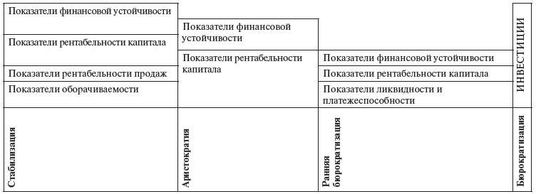 Дальнейшая судьба компании, теряющей свои конкурентные преимущества, зависит исключительно от инвесторов, поэтому на этапе ранней бюрократизации приоритетными ориентирами предпринимательской деятельности становятся показатели рентабельности капитала, финансовой устойчивости, ликвидности и платежеспособности, которые, однако, зачастую имеют неудовлетворительные значения. И.А. Бланк отмечает, что на последних стадиях жизненного цикла финансовая стратегия предприятия «призвана обеспечить эффективное дезинвестирование и высокую маневренность использования высвобождаемого капитала в целях обеспечения дальнейшей финансовой стабилизации»128.