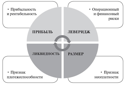 Впрочем, вопрос о наиболее важных признаках финансовой несостоятельности остается открытым. Исследование корпорации KMV показало, что основу эмпирических моделей прогнозирования финансовой несостоятельности, как правило, составляют четыре базовых характеристики предприятия: размер, ликвидность, леверидж и прибыль152. Данные характеристики, с нашей точки зрения, напрямую связаны с финансовым смыслом банкротства. Хронически убыточное предприятие, не оправдывающее основную цель своей деятельности и (или) принимающее чрезмерные риски, вряд ли будет реабилитировано в кризисной ситуации. Ликвидность фирмы имеет прямое отношение к оценке признака неплатежеспособности, тогда как размер, чаще всего понимаемый как величина собственного капитала, – к признаку неоплатности (недостаточности имущества) (рис. 2.2).