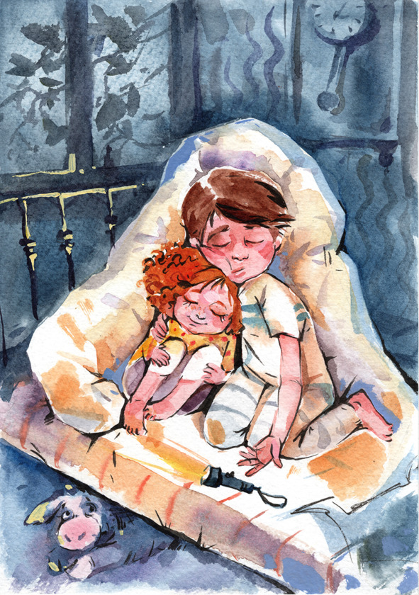 В новой детской Костя и Маша долго не могли уснуть. Где-то скрипел пол, ветер качал ветки деревьев, кругом то и дело всплывали незнакомые шорохи и звуки. Чтобы не бояться, ребята уселись на одной кровати, вместе укутались в одеяло и включили фонарик. За день и Маша, и Костя так устали, что сил на пререкания и ругань просто не было. Они решили дежурить и не спать всю ночь, но сон в этой схватке взял верх. Побежденные ребята так и уснули в обнимку полусидя, что на них совсем не было похоже. Фонарик продолжал светить, пока не села батарейка. Костя и Маша тихо посапывали, уткнувшись в друг друга, а на чердаке слышались быстрые и мелкие шаги. Кто-то тихо переступал по деревянному полу, сновал взад и вперед в беспокойстве от нового соседства с людьми. Чьи-то маленькие ножки так отчётливо пробегали по чердаку, но этого ребята уже не слышали, потому что крепко спали.