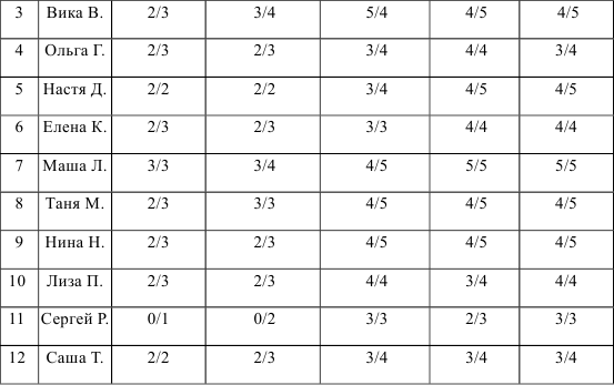Показатели повышения уровня развития студента как субъекта общения (до обучения – в числителе, после обучения – в знаменателе)