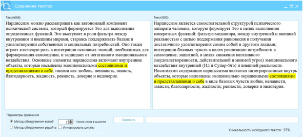 Рисунок 33 – Сверка текстов на отличие по методу Ш2, левое окно – текст КонтрПлагиата, правое окно – контекст, отличие текстов 97%