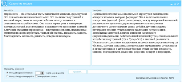 Как видно, наименьшее значение шингла = 3 словам, для получения уникального текста, который успешно пройдет проверку в АП ВУЗ необходимо добиться отличие текста рерайта от текста источника на уровне 100%.