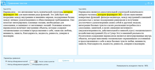 Рисунок 30.1 – Перефразированный текст, левое окно, источник – правое окно, отличие Ш2=96%