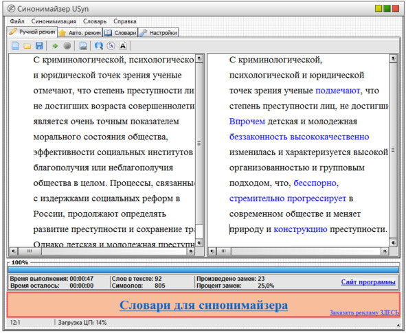 Напомним, что ручную синонимизацию мы рекомендуем использовать после автоматизированных методов рерайта, на этапе доводки отличия текста до нужных параметров, что позволяет быстро выполнить большой объём работы и достичь высокого показателя оригинальности.