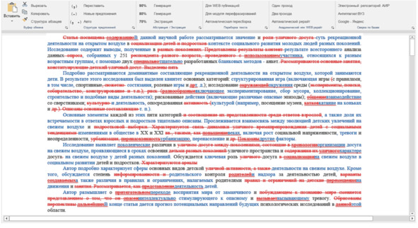 Говоря о глубоком рерайте рассмотрим результат КонтрПлагиата, рис. 32 и 33. Как видно из скриншота, красный, зачеркнутый текст выделяет слова и фразы, удаленные из текста, синим цветом помечен текст, который написан заново, остатки текста источника, в виде одиночных слов выделены черным шрифтом.
